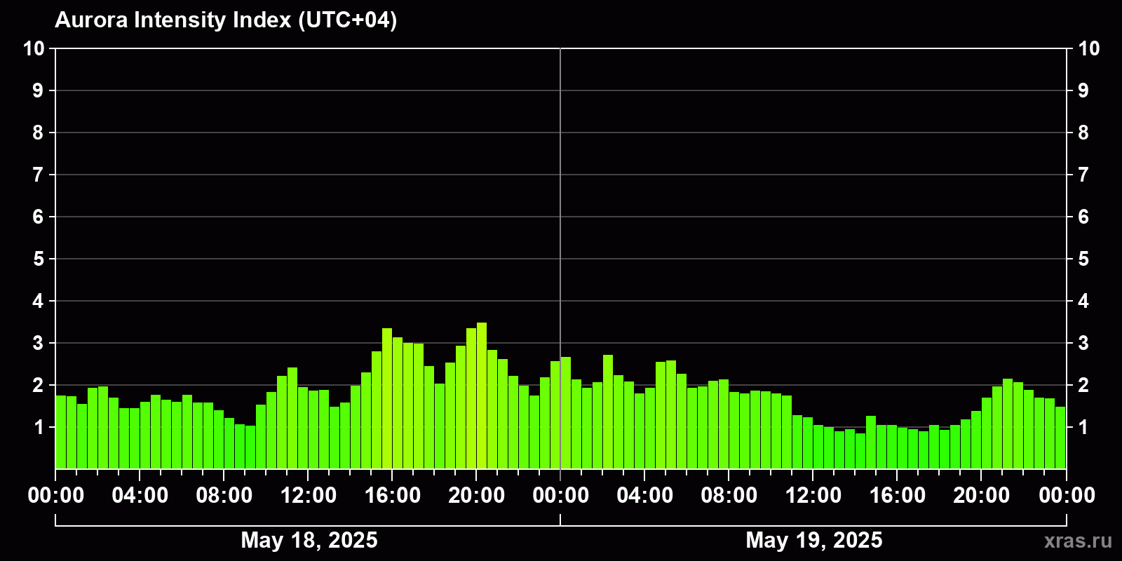Auroral intensity index and the theoretically possible latitude of observations for nighttime in the Estern Hemisphere as of 2025-05-19 23:59 (end of day) local time