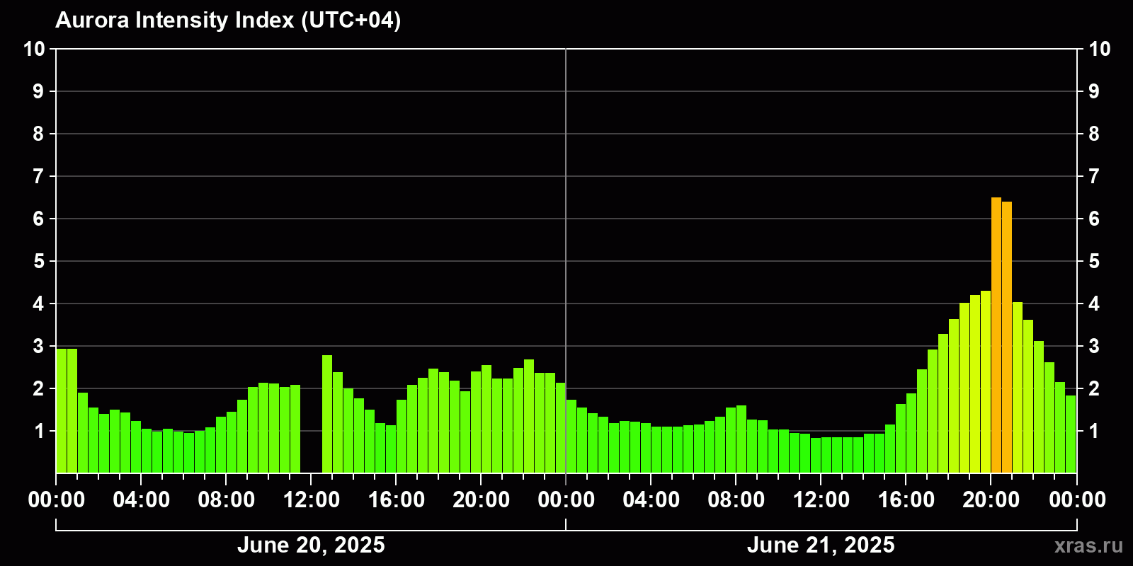 Auroral intensity index and the theoretically possible latitude of observations for nighttime in the Estern Hemisphere as of 2025-06-21 23:48 (end of day) local time