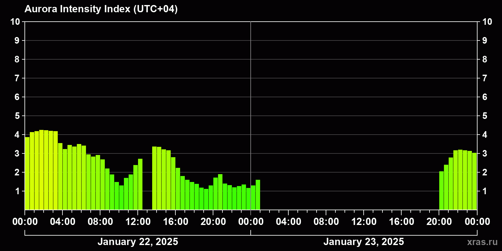 Auroral intensity index and the theoretically possible latitude of observations for nighttime in the Estern Hemisphere as of 2025-01-23 23:56 (end of day) local time