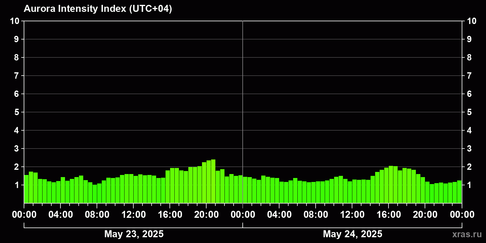Auroral intensity index and the theoretically possible latitude of observations for nighttime in the Estern Hemisphere as of 2025-05-24 23:54 (end of day) local time