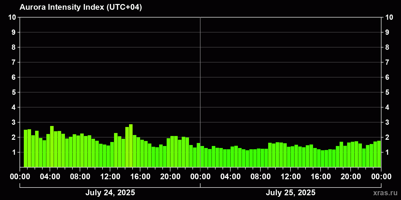 Auroral intensity index and the theoretically possible latitude of observations for nighttime in the Estern Hemisphere as of 2025-07-25 23:56 (end of day) local time