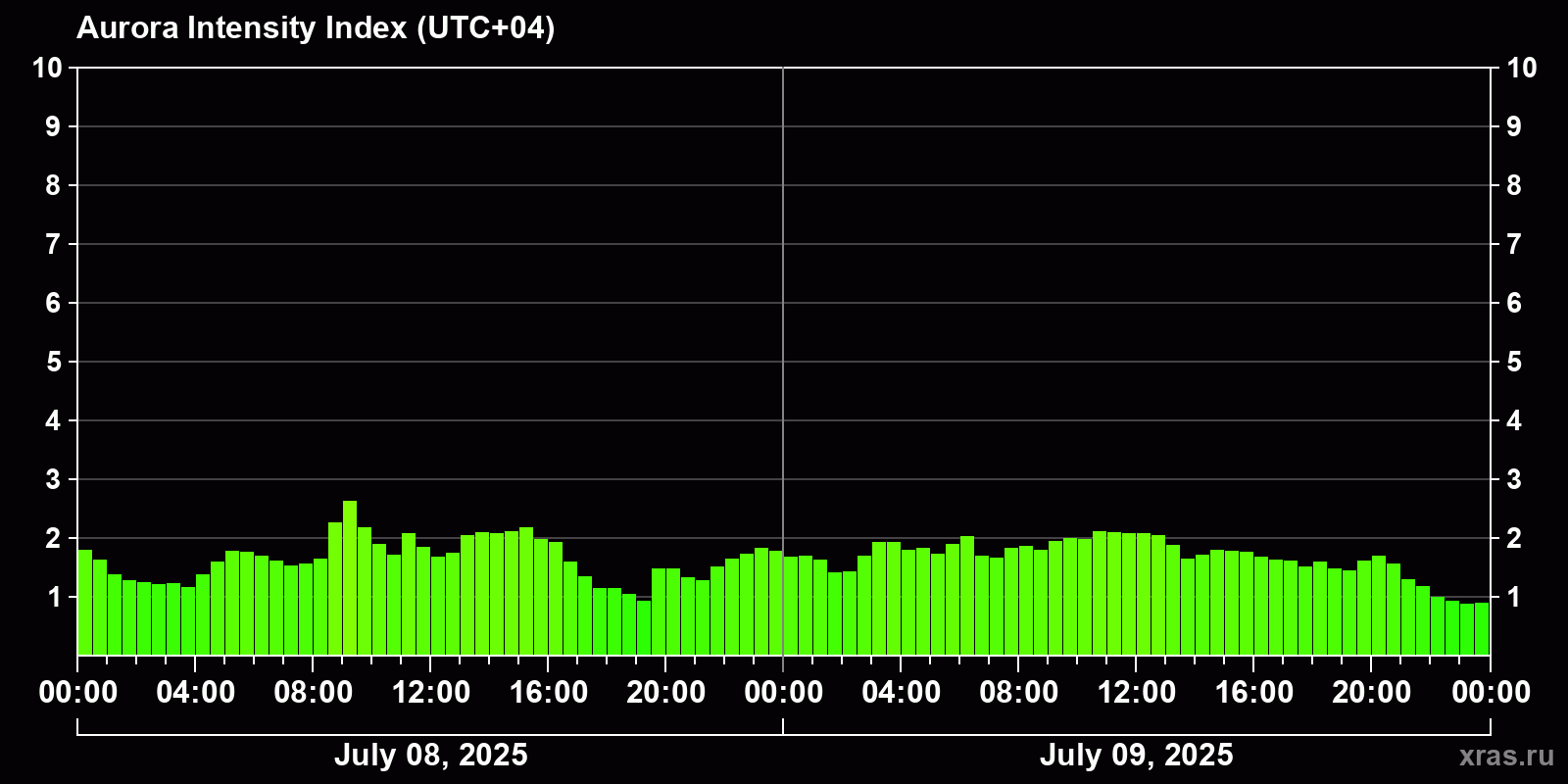 Changes in the auroral intensity index from 2025-07-08 to 2025-07-09 local time