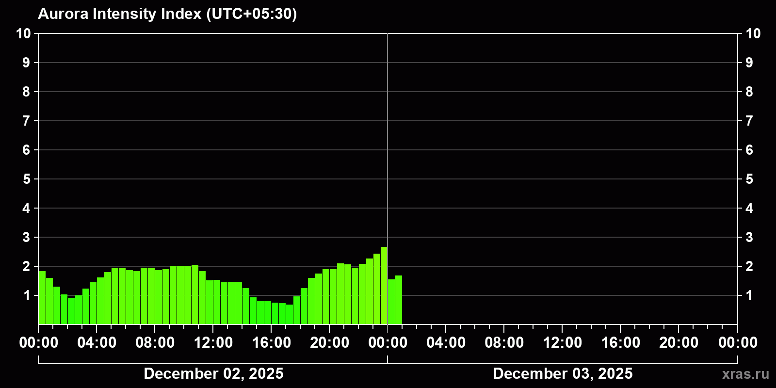 Изменения и часовой прогноз индекса интенсивности полярных сияний с 2025-11-30 по 2025-12-01