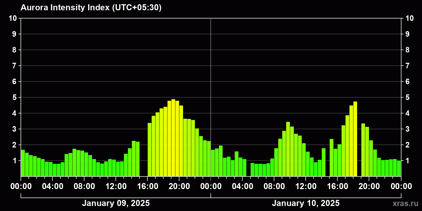 Auroral intensity index and the theoretically possible latitude of observations for nighttime in the Estern Hemisphere as of 2025-01-10 23:47 (end of day) local time