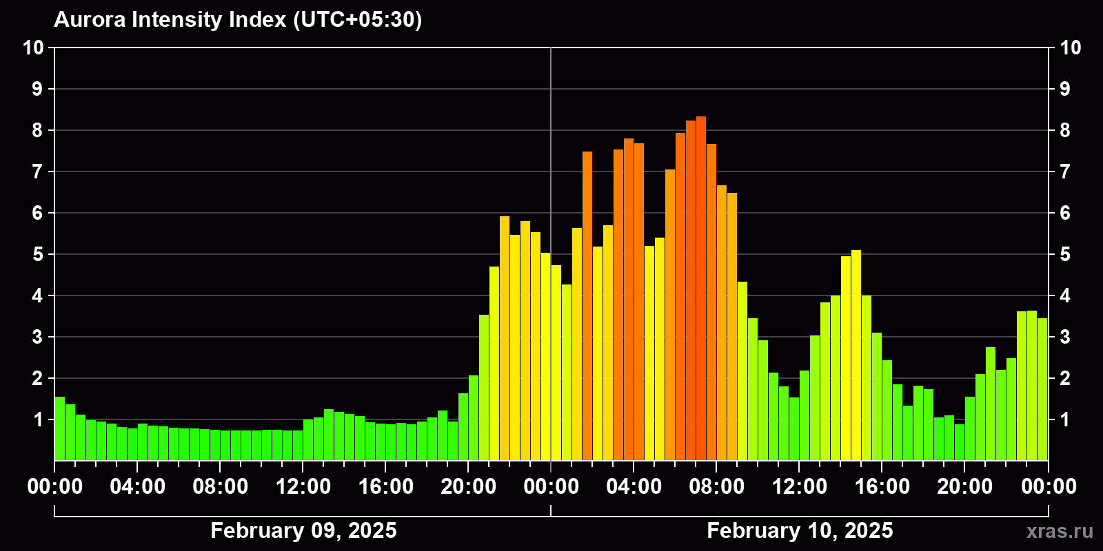 Auroral intensity index and the theoretically possible latitude of observations for nighttime in the Estern Hemisphere as of 2025-02-10 23:55 (end of day) local time