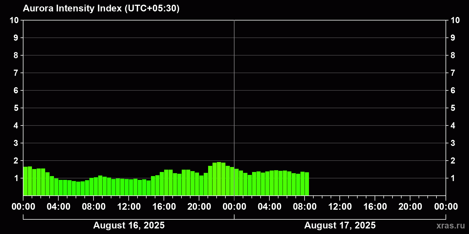 Auroral intensity index and the theoretically possible latitude of observations for nighttime in the Estern Hemisphere as of 2025-08-17 08:17 (end of day) local time