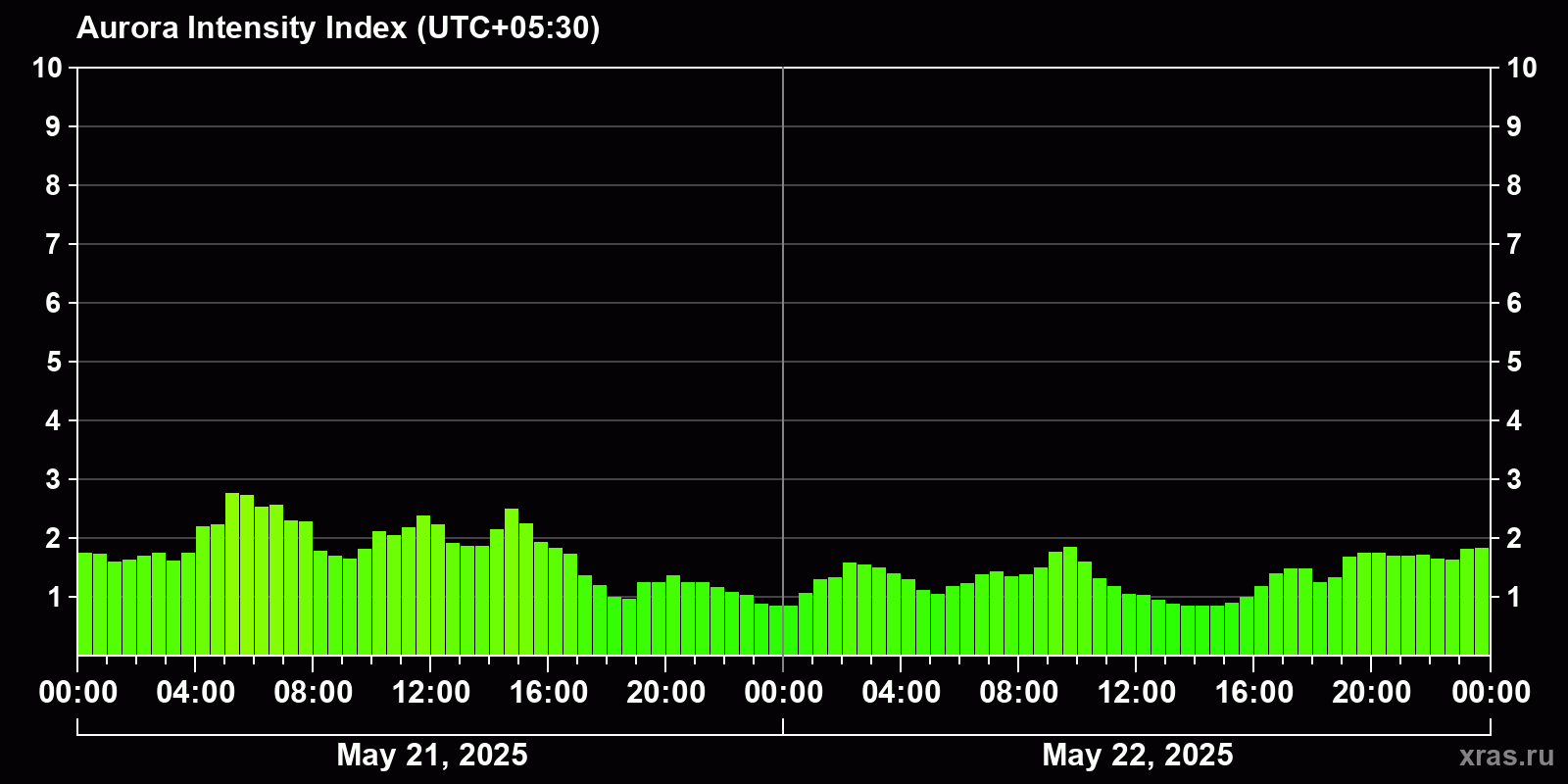 Changes in the auroral intensity index from 2025-05-21 to 2025-05-22 local time