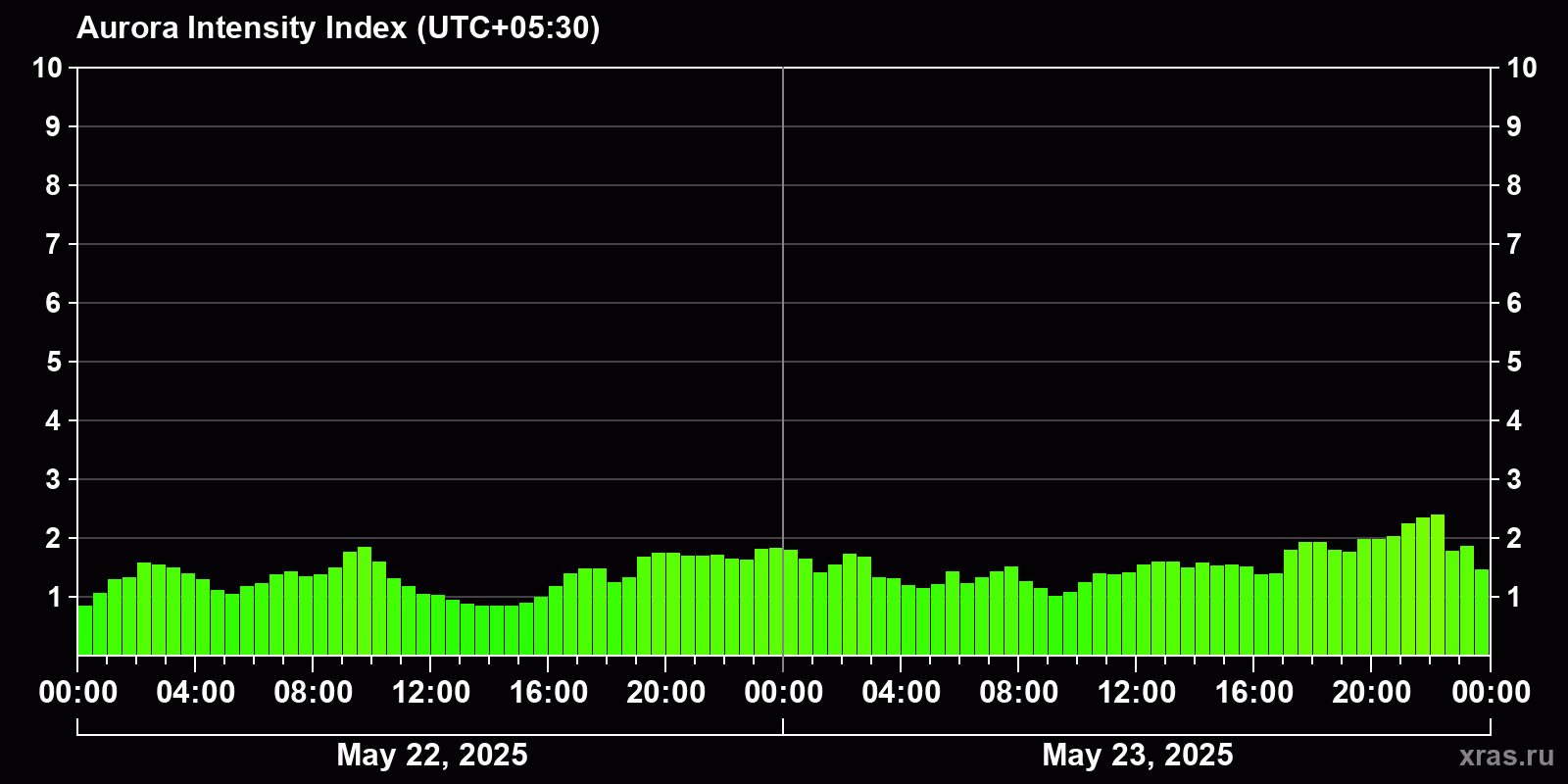 Auroral intensity index and the theoretically possible latitude of observations for nighttime in the Estern Hemisphere as of 2025-05-23 23:59 (end of day) local time