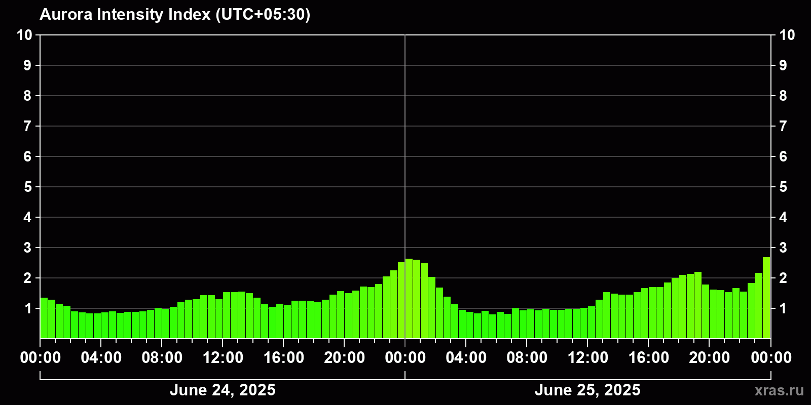 Auroral intensity index and the theoretically possible latitude of observations for nighttime in the Estern Hemisphere as of 2025-06-25 23:59 (end of day) local time