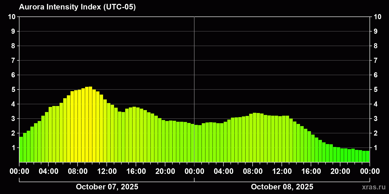 Auroral intensity index and the theoretically possible latitude of observations for nighttime in the Western Hemisphere as of 2025-10-08 23:44 (end of day) local time