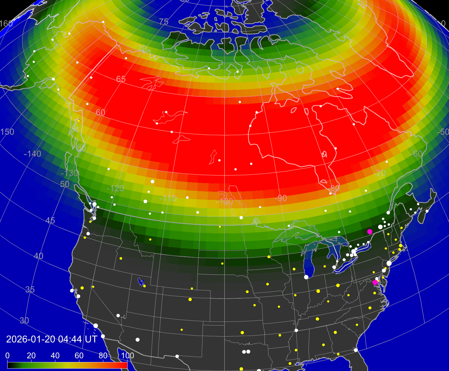 Вероятность полярных сияний в городах США