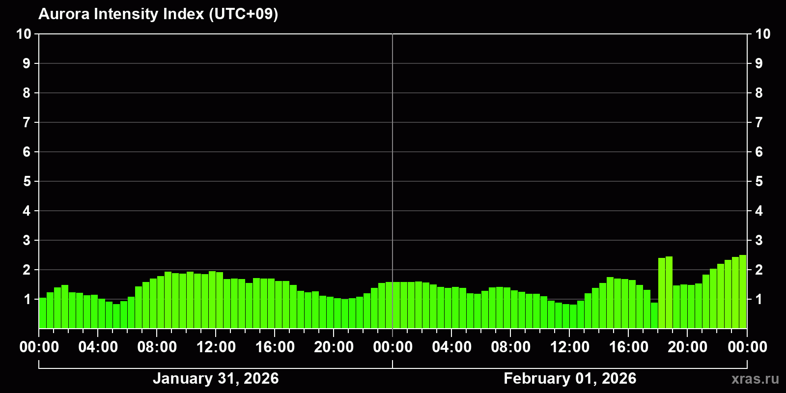 Changes in the auroral intensity index from 2026-01-31 to 2026-02-01 local time
