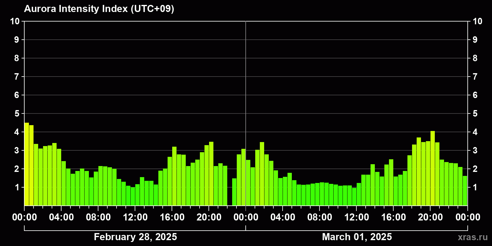 Changes in the auroral intensity index from 2025-02-28 to 2025-03-01 local time