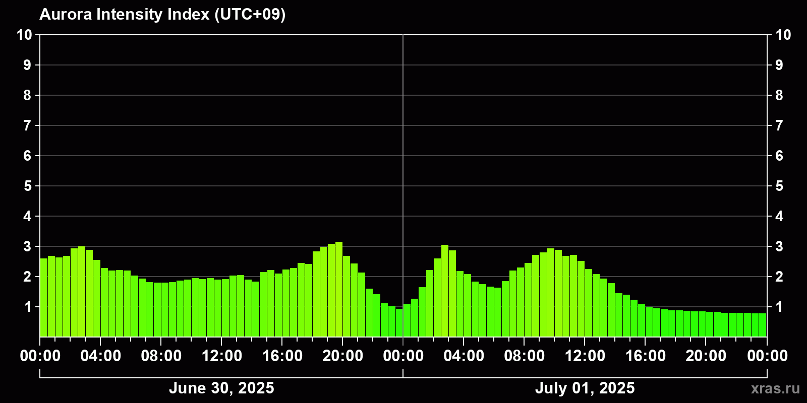 Changes in the auroral intensity index from 2025-06-30 to 2025-07-01 local time
