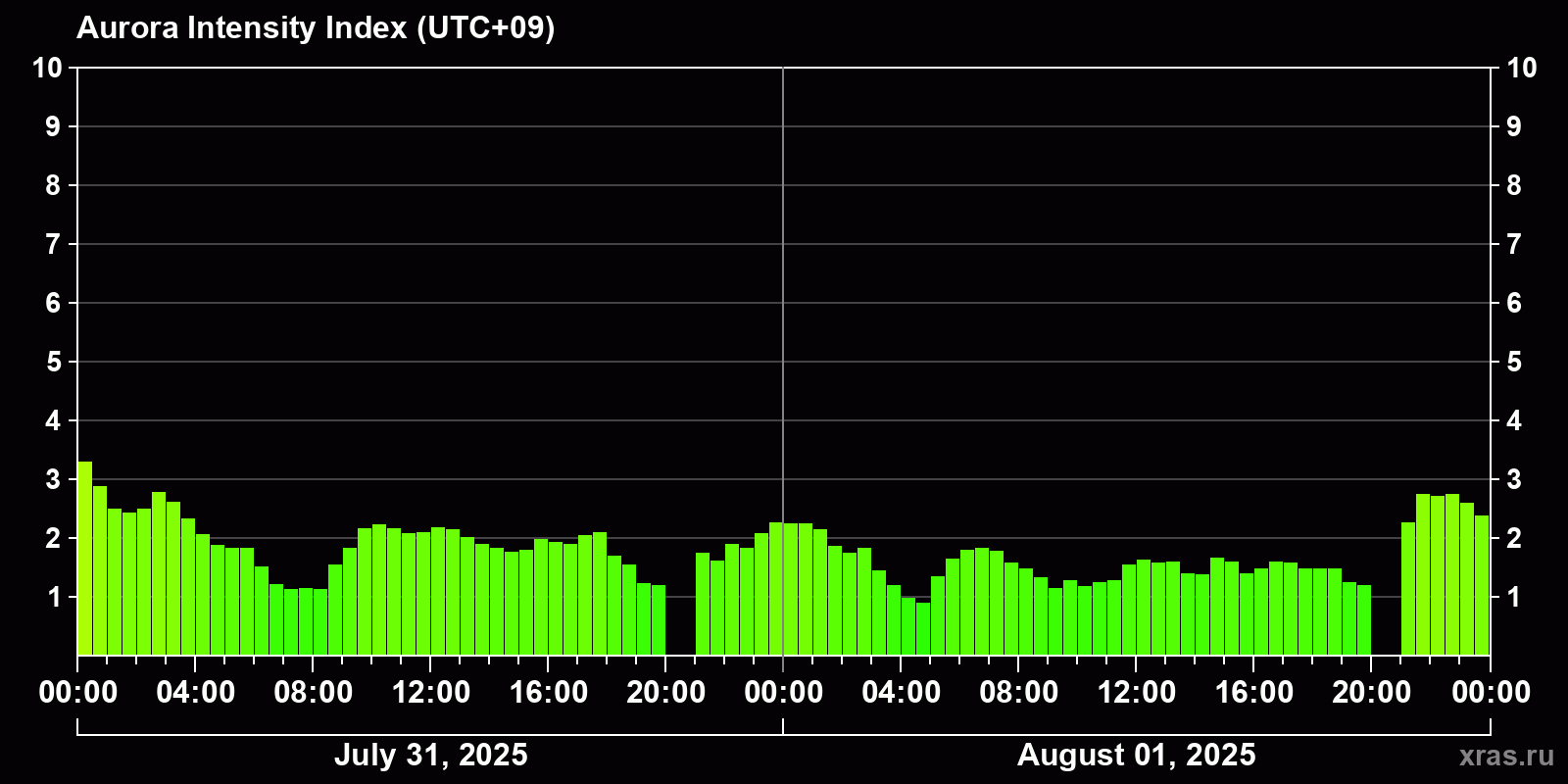 Changes in the auroral intensity index from 2025-07-31 to 2025-08-01 local time
