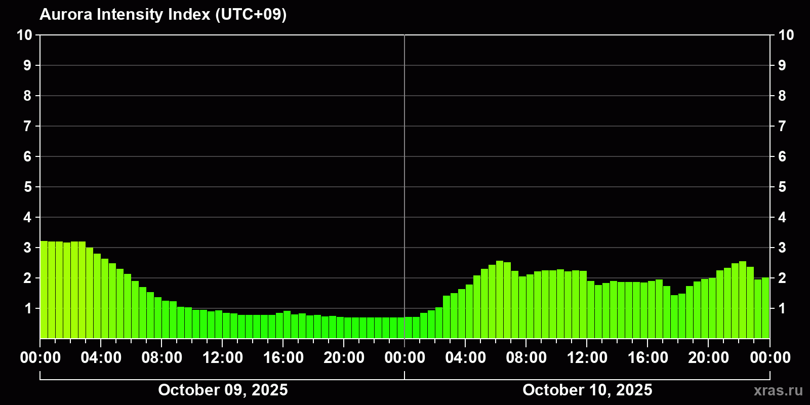 Changes in the auroral intensity index from 2025-10-09 to 2025-10-10 local time
