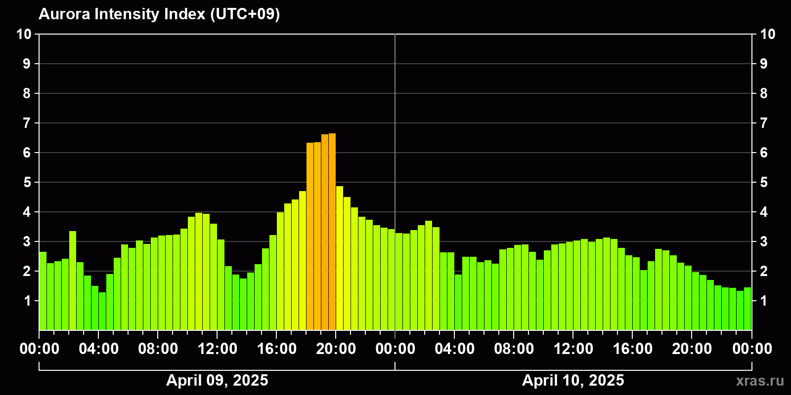 Changes in the auroral intensity index from 2025-04-09 to 2025-04-10 local time