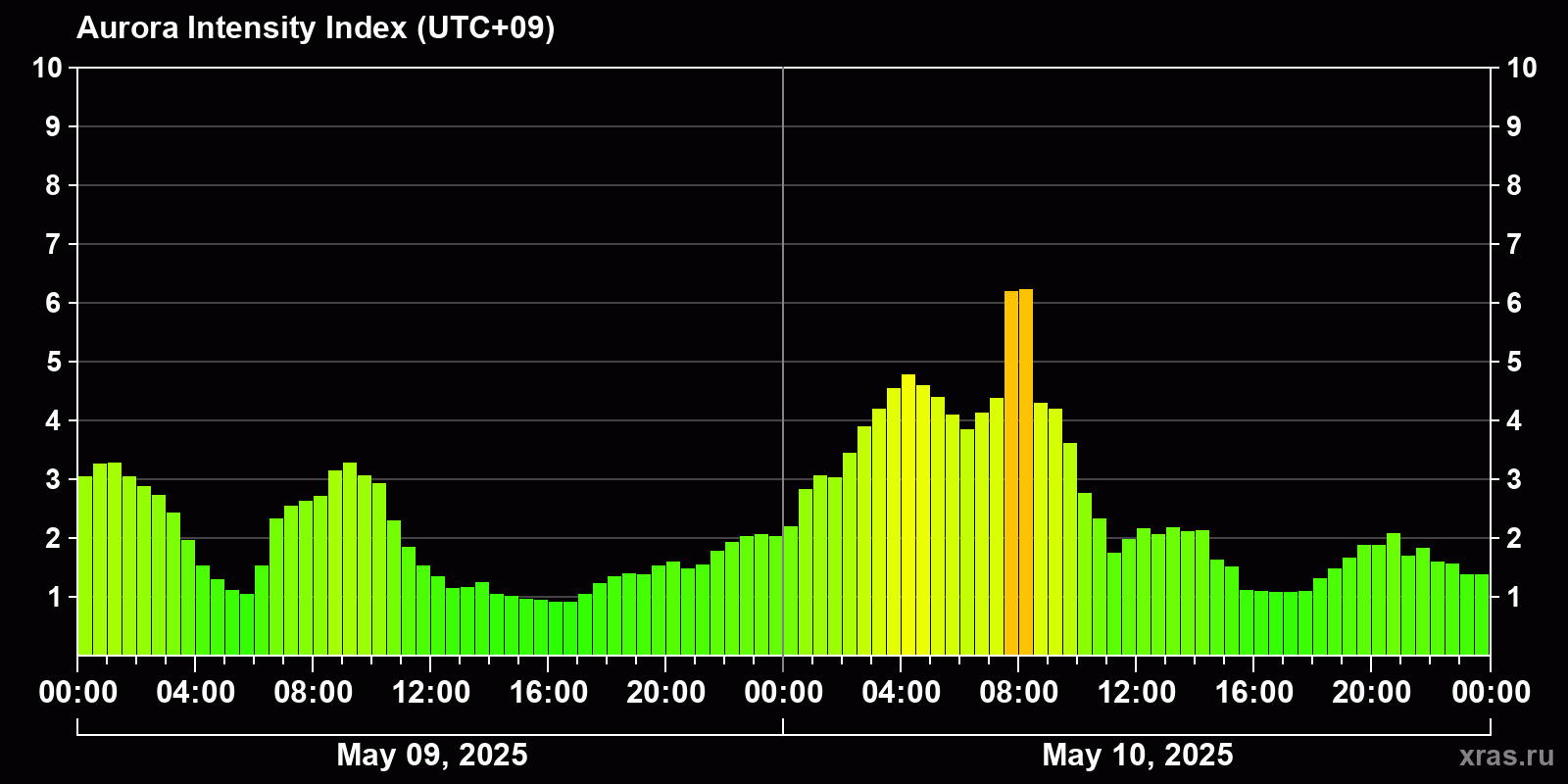 Changes in the auroral intensity index from 2025-05-09 to 2025-05-10 local time