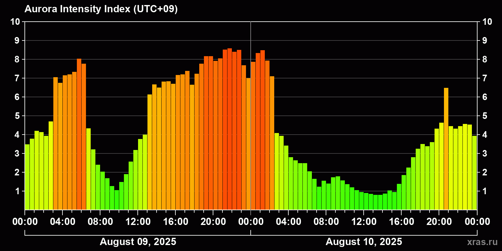 Changes in the auroral intensity index from 2025-08-09 to 2025-08-10 local time