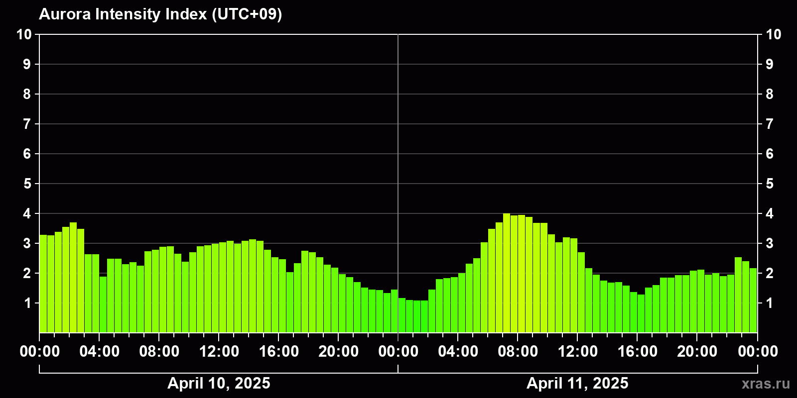 Changes in the auroral intensity index from 2025-04-10 to 2025-04-11 local time