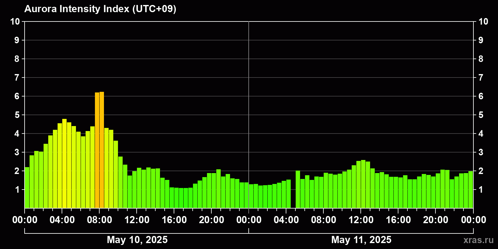 Changes in the auroral intensity index from 2025-05-10 to 2025-05-11 local time