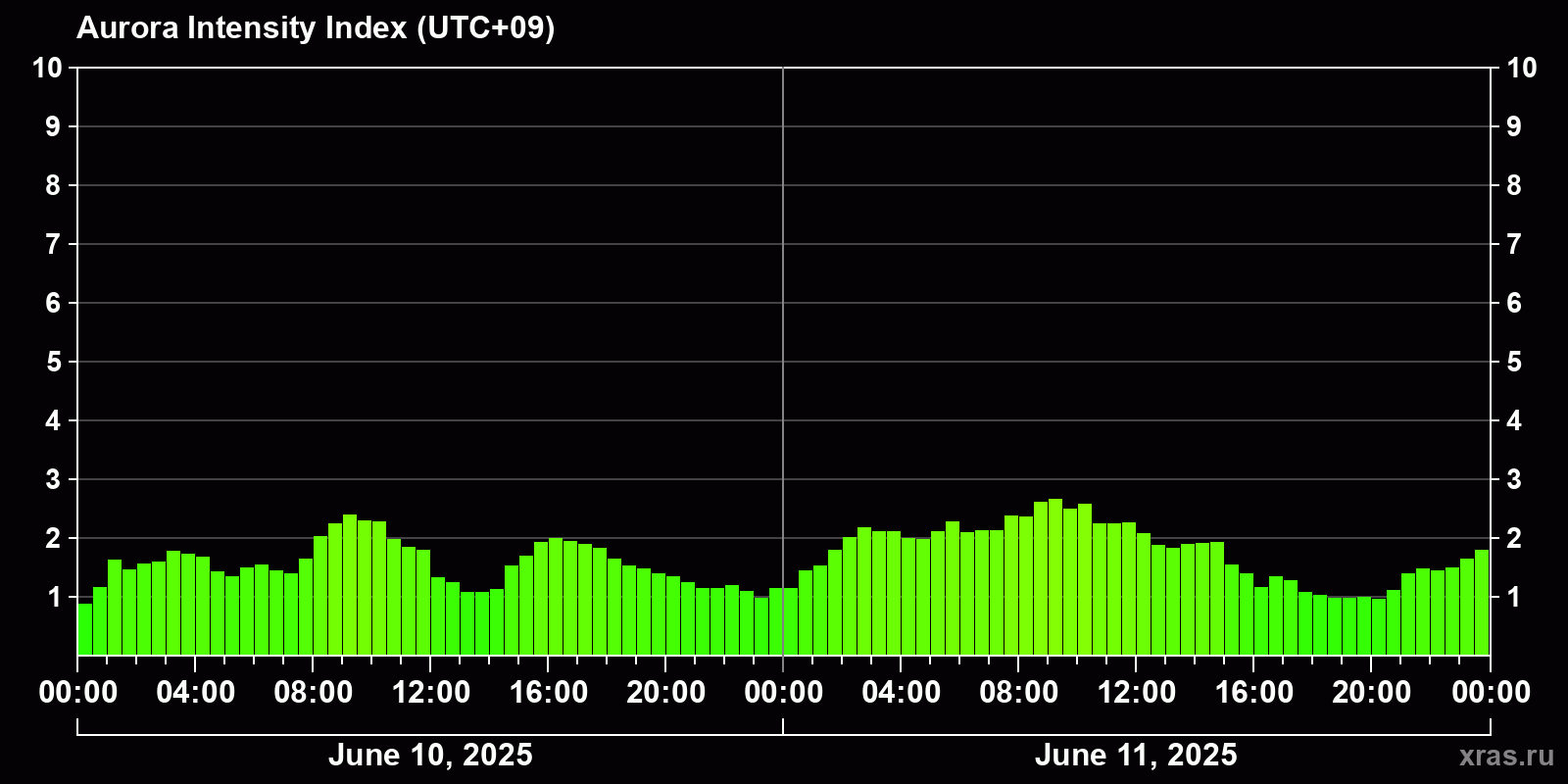 Changes in the auroral intensity index from 2025-06-10 to 2025-06-11 local time