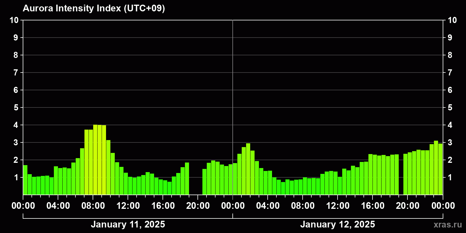 Changes in the auroral intensity index from 2025-01-11 to 2025-01-12 local time