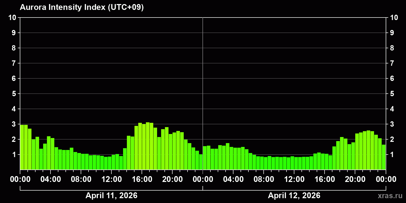 Changes in the auroral intensity index from 2026-04-11 to 2026-04-12 local time