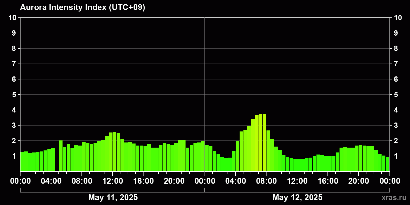 Changes in the auroral intensity index from 2025-05-11 to 2025-05-12 local time