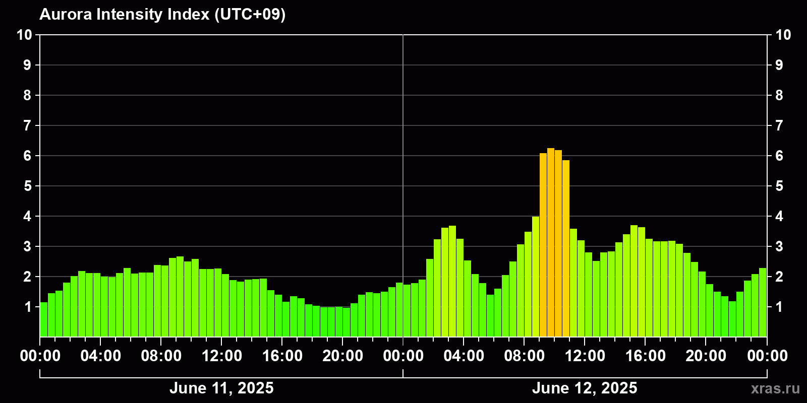 Changes in the auroral intensity index from 2025-06-11 to 2025-06-12 local time