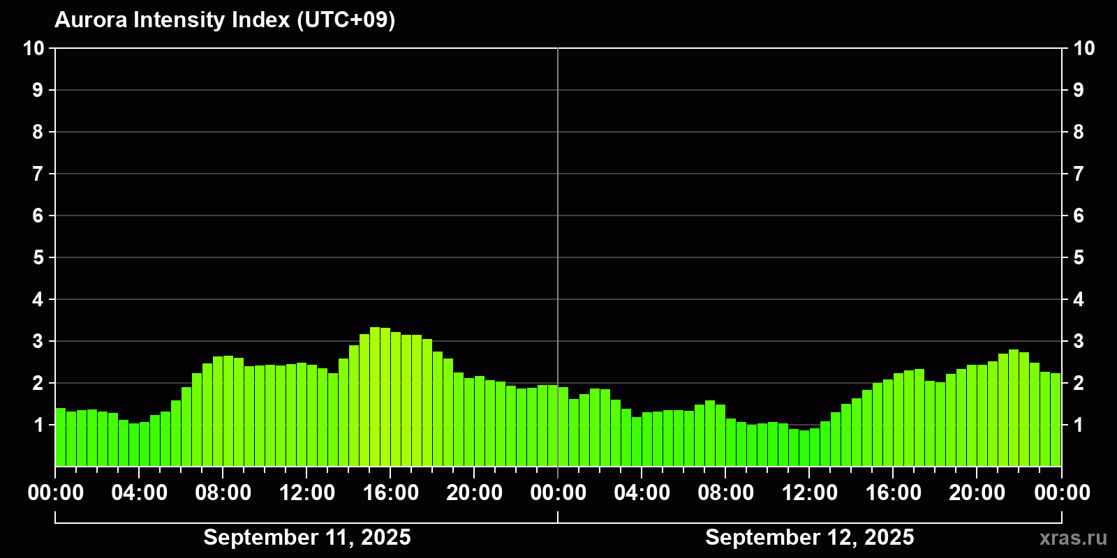Changes in the auroral intensity index from 2025-09-11 to 2025-09-12 local time