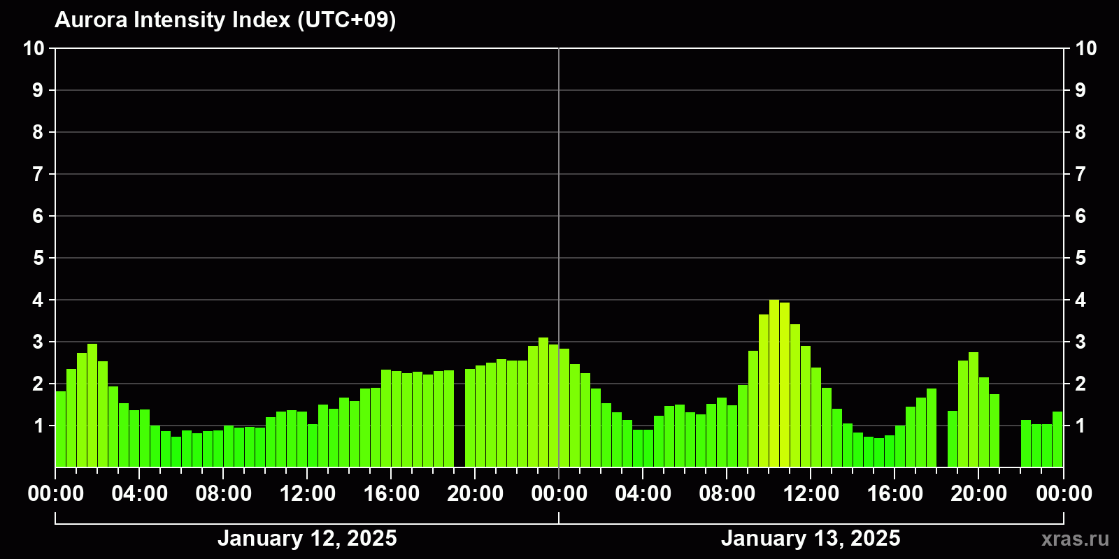 Changes in the auroral intensity index from 2025-01-12 to 2025-01-13 local time