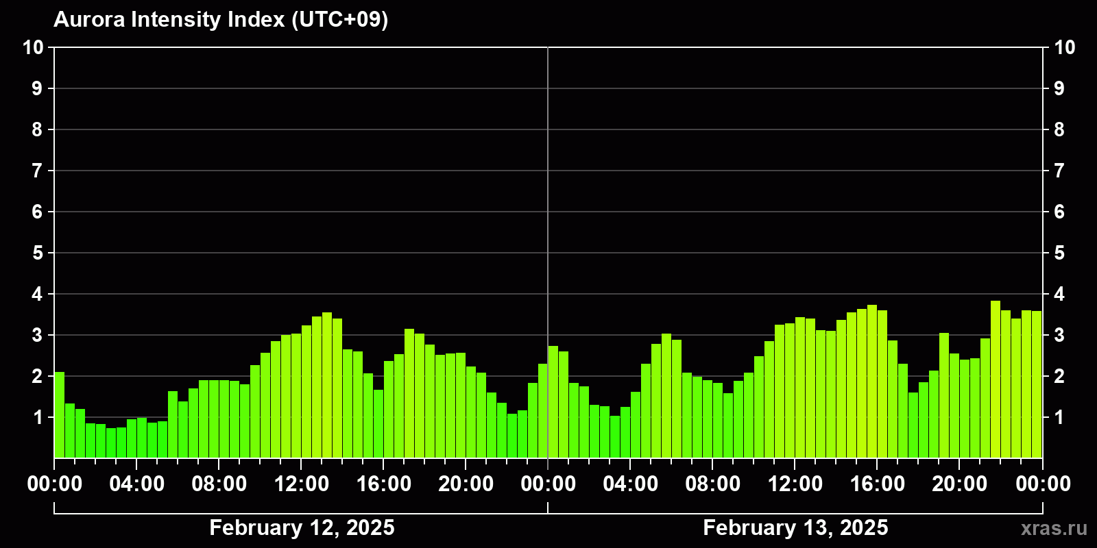 Changes in the auroral intensity index from 2025-02-12 to 2025-02-13 local time
