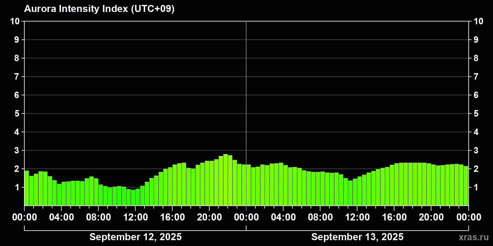 Changes in the auroral intensity index from 2025-09-12 to 2025-09-13 local time