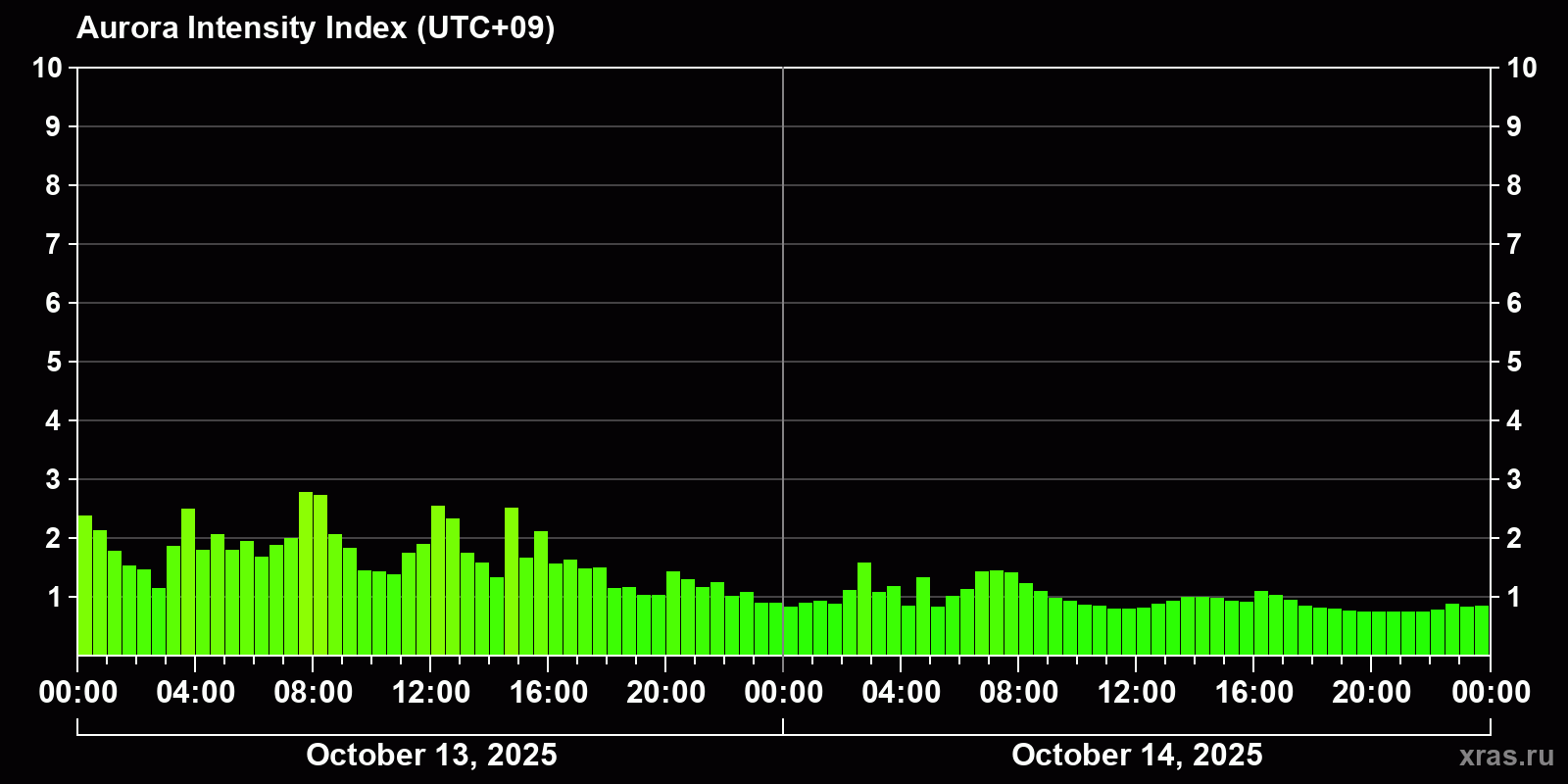 Changes in the auroral intensity index from 2025-10-13 to 2025-10-14 local time