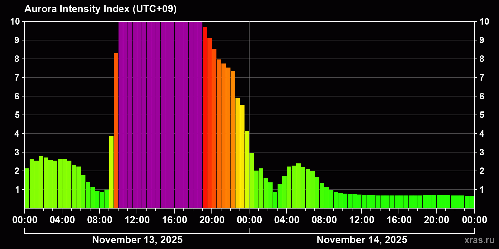 Changes in the auroral intensity index from 2025-11-13 to 2025-11-14 local time