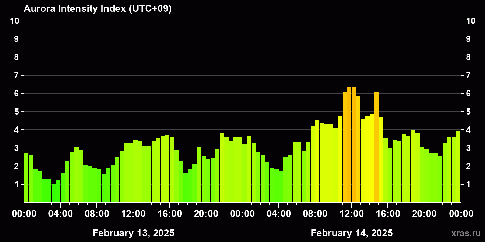 Changes in the auroral intensity index from 2025-02-13 to 2025-02-14 local time