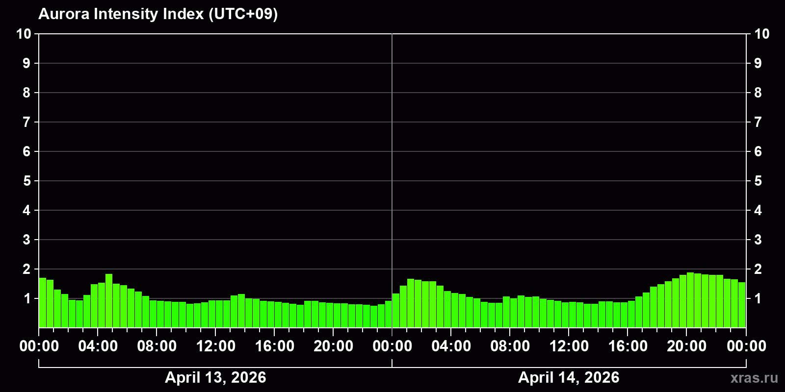 Changes in the auroral intensity index from 2026-04-13 to 2026-04-14 local time