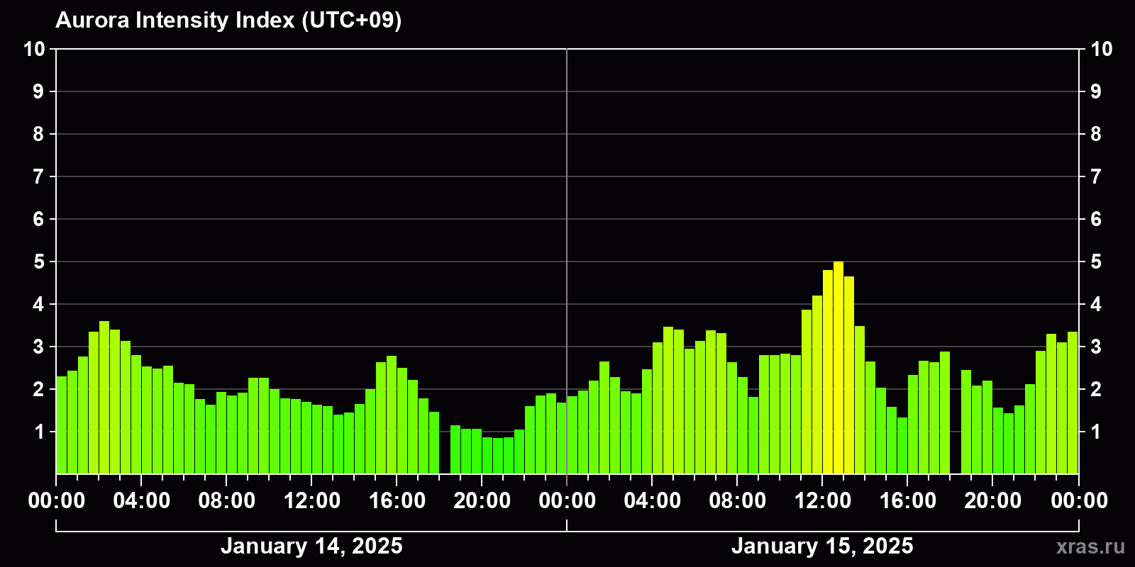 Changes in the auroral intensity index from 2025-01-14 to 2025-01-15 local time