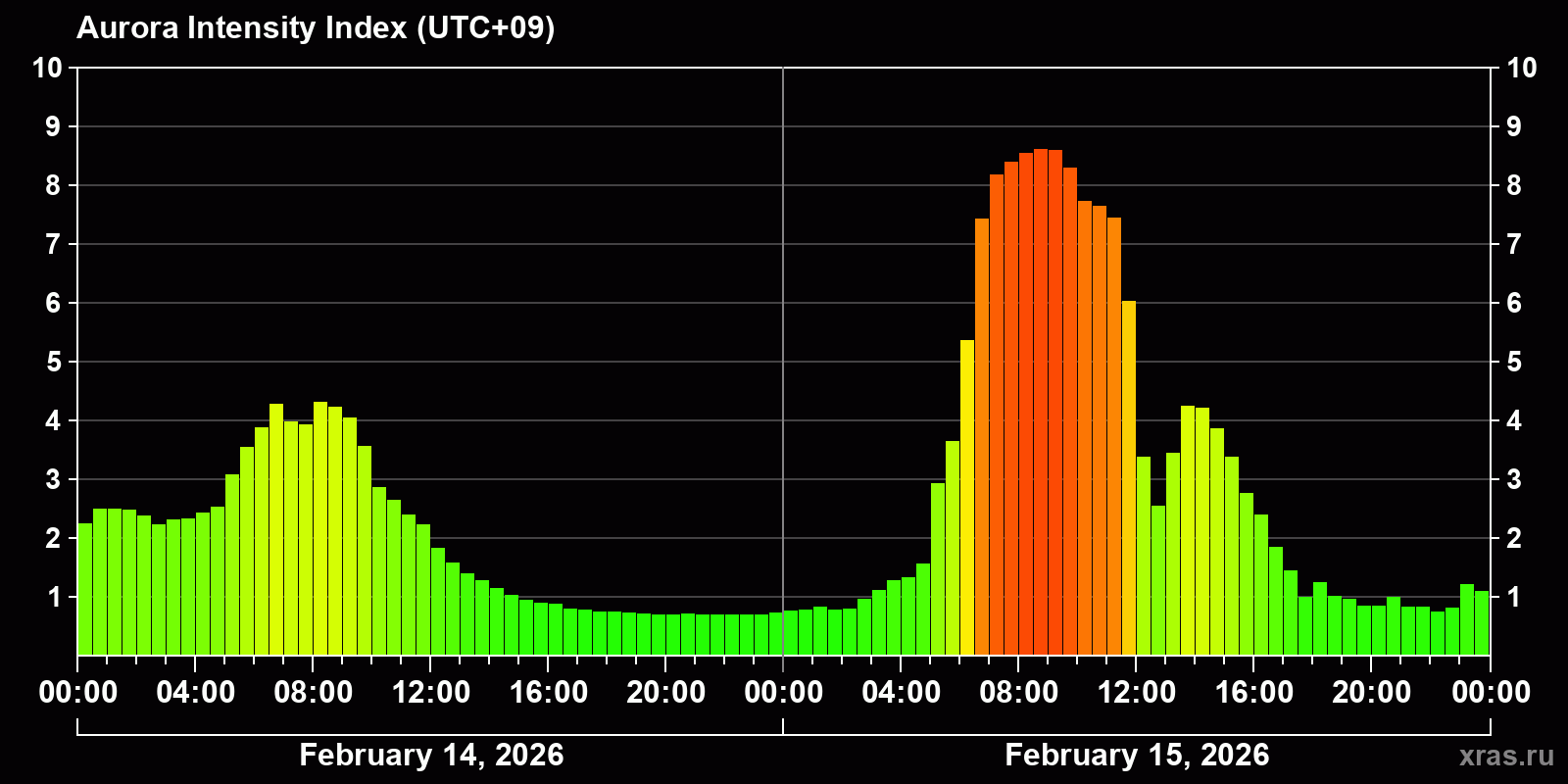 Changes in the auroral intensity index from 2026-02-14 to 2026-02-15 local time