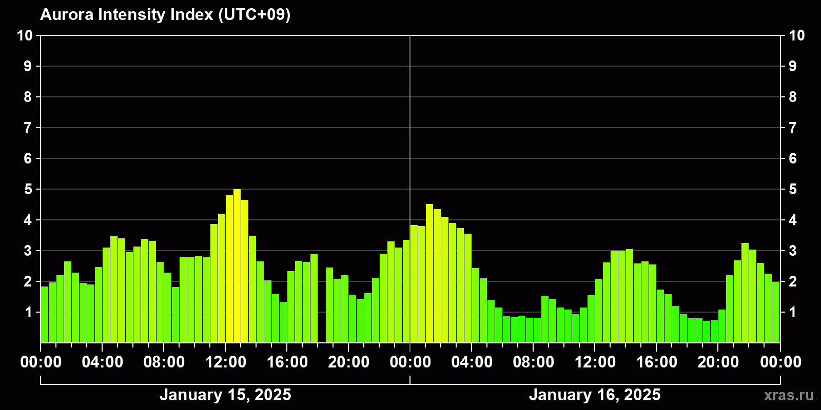 Changes in the auroral intensity index from 2025-01-15 to 2025-01-16 local time