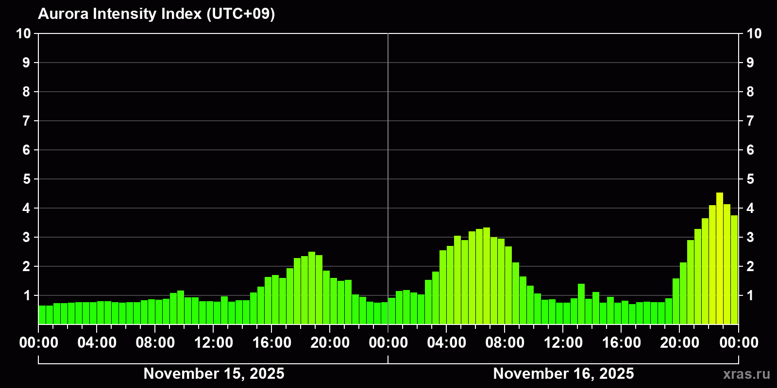 Changes in the auroral intensity index from 2025-11-15 to 2025-11-16 local time