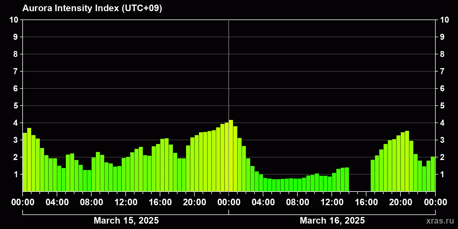 Changes in the auroral intensity index from 2025-03-15 to 2025-03-16 local time