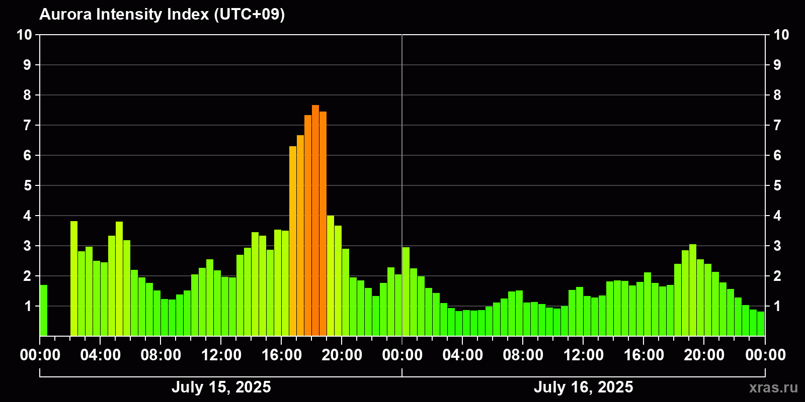 Changes in the auroral intensity index from 2025-07-15 to 2025-07-16 local time