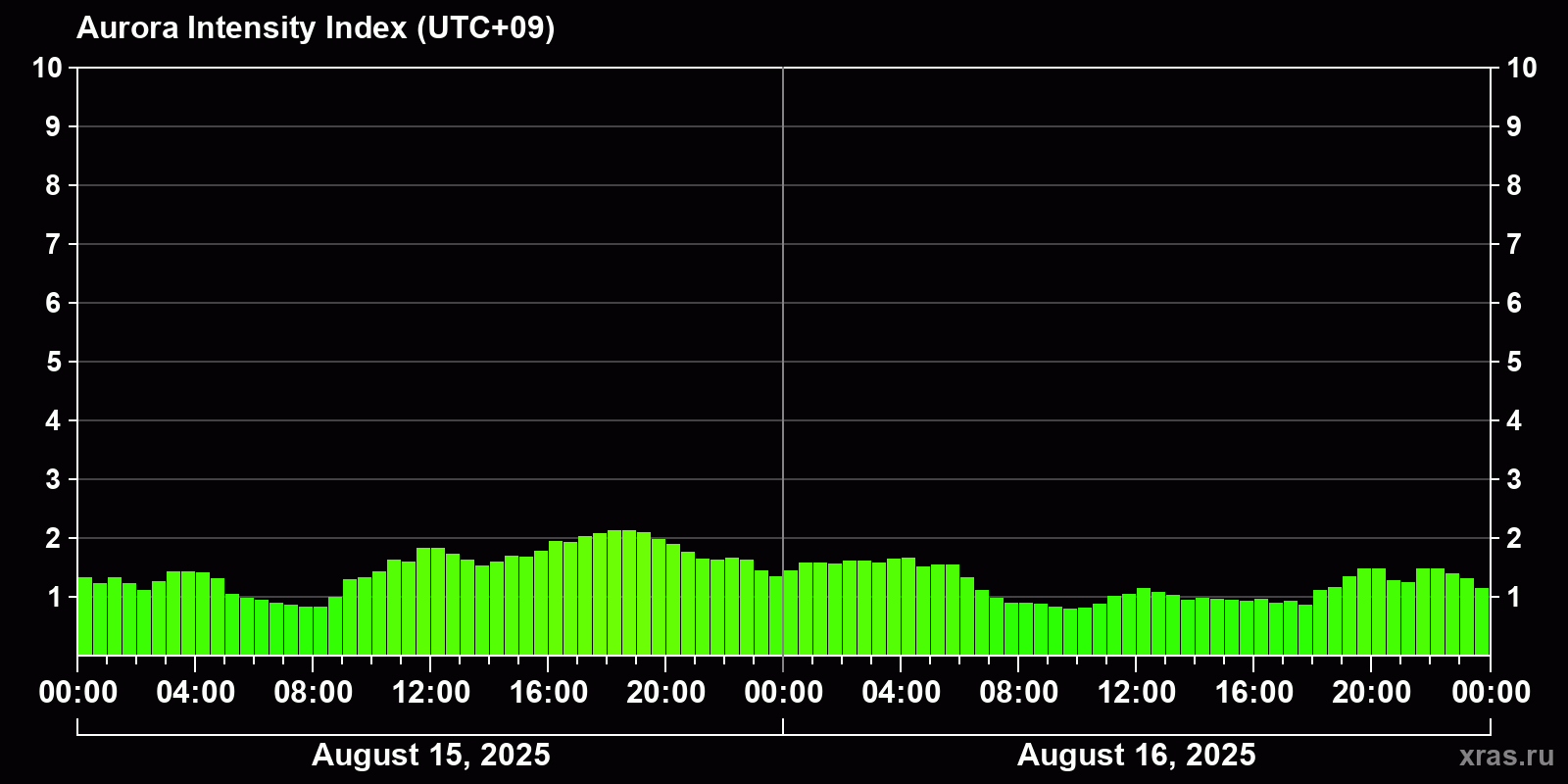 Changes in the auroral intensity index from 2025-08-15 to 2025-08-16 local time