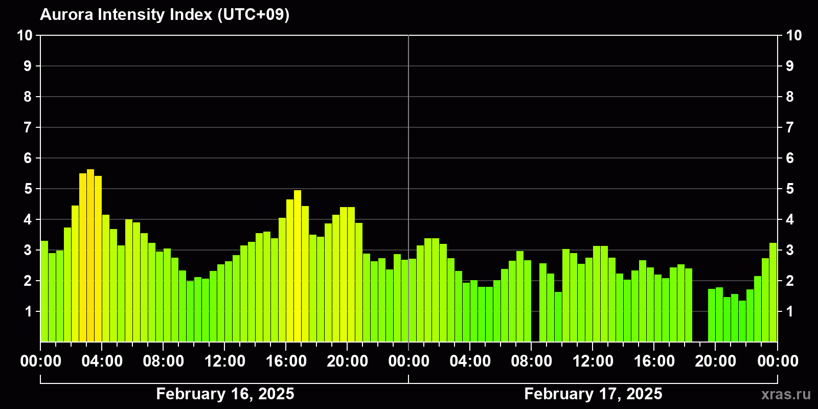 Changes in the auroral intensity index from 2025-02-16 to 2025-02-17 local time