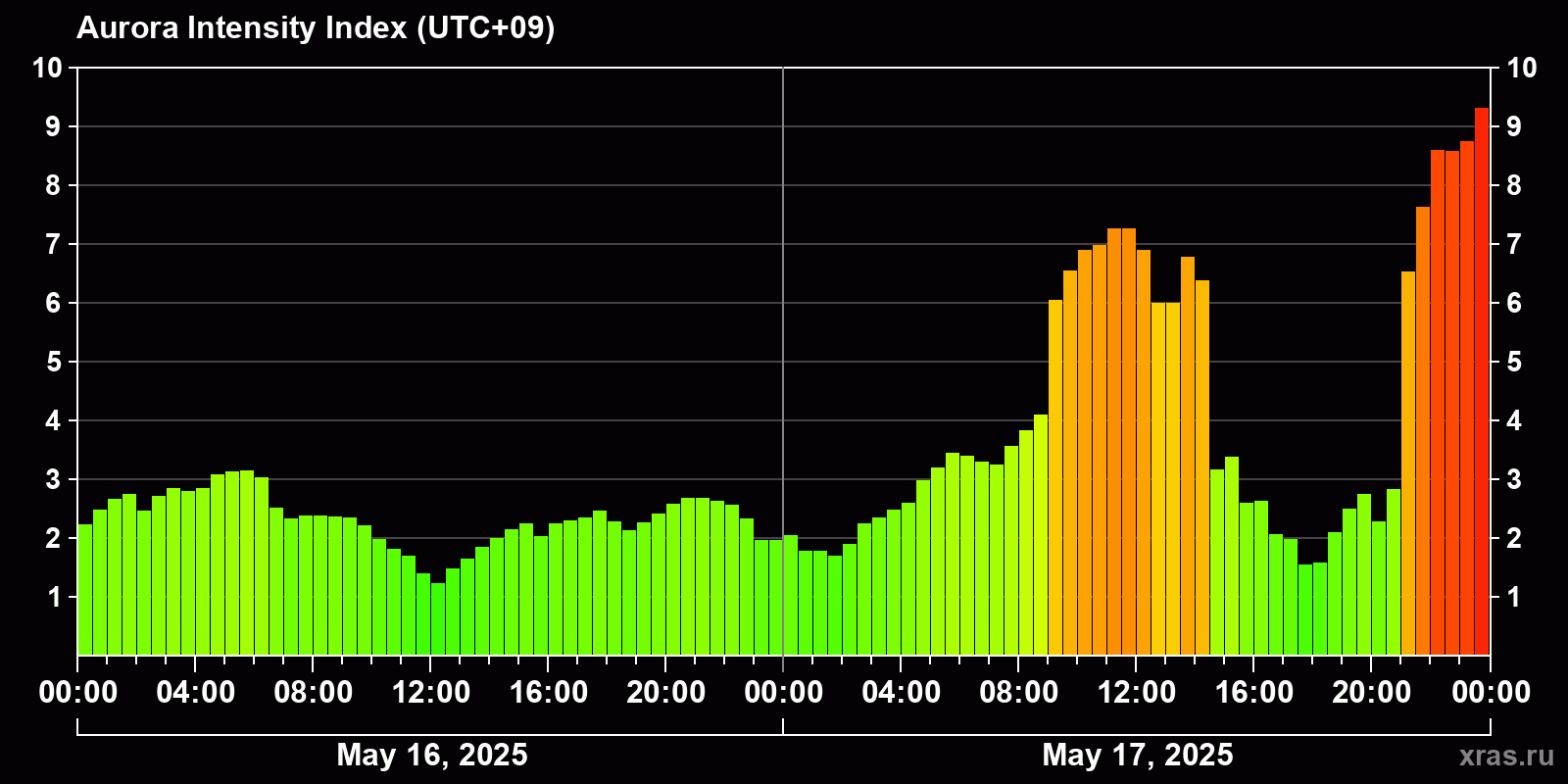 Changes in the auroral intensity index from 2025-05-16 to 2025-05-17 local time