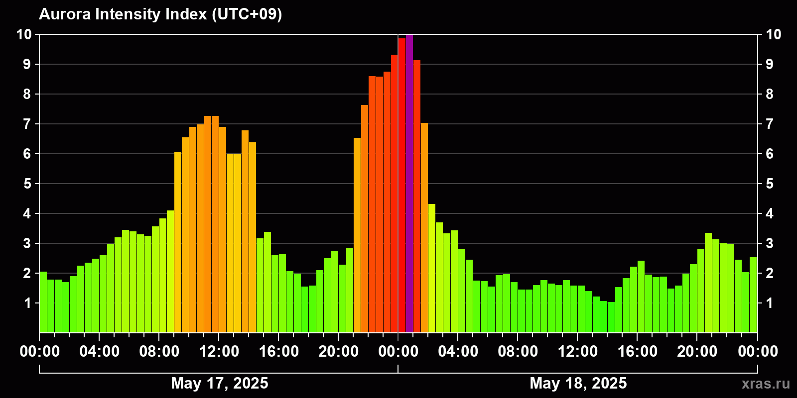 Changes in the auroral intensity index from 2025-05-17 to 2025-05-18 local time