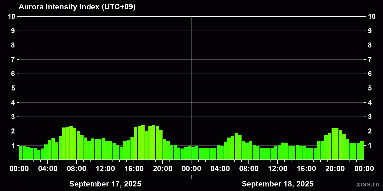 Changes in the auroral intensity index from 2025-09-17 to 2025-09-18 local time