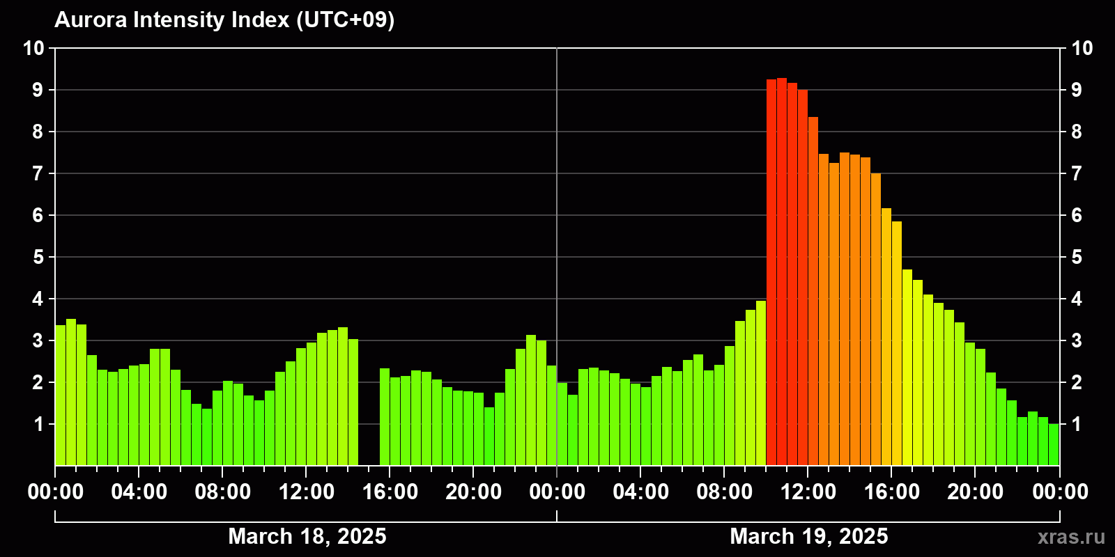 Changes in the auroral intensity index from 2025-03-18 to 2025-03-19 local time